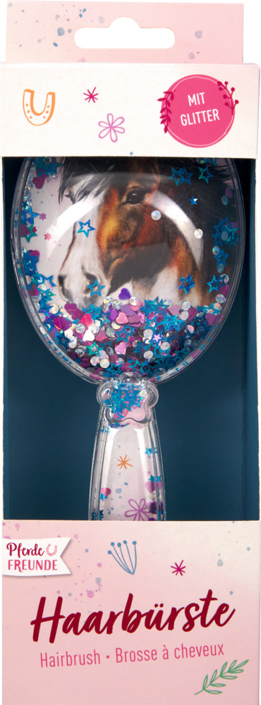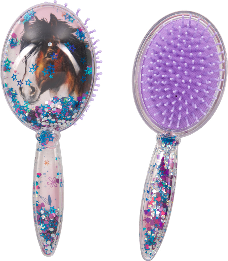 Diese funkelnde Glitzer-Haarbürste mit liebevollem Pferdemotiv bringt jedes Kinderherz zum Strahlen. Sanfte Borsten entwirren das Haar schonend, während das glitzernde Design für magische Bürstmomente sorgt – perfekt für kleine Pferdefans!