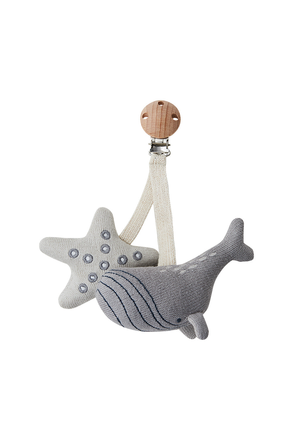 Dieser schöne Kinderwagenanhänger als Wal und Seestern von Leevje lässt sich mit einem Clip ganz einfach befestigen. Die liebevoll gestalteten Elemente haben besondere Eigenschaften wie Quietschen oder Knistern.