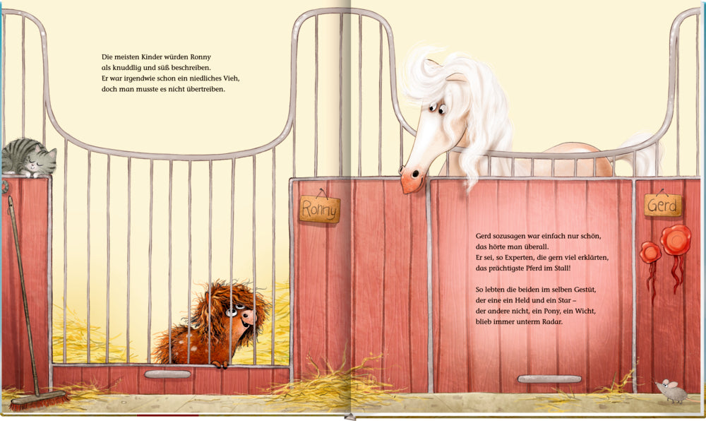 Ronny das Pony, war außergewöhnlich klein, so klein, dass er sogar stehend in einen Karton passte. Neben Gerd, dem prächtigen Pferd, hatte es Ronny nicht leicht. Gerd war groß, anmutig, mit glänzendem Fell und bekam das beste Futter. Doch eines Nachts bricht im Stall ein Feuer aus, und plötzlich zeigt Ronny, dass es nicht auf die Größe ankommt, um ein wahrer Held zu sein.